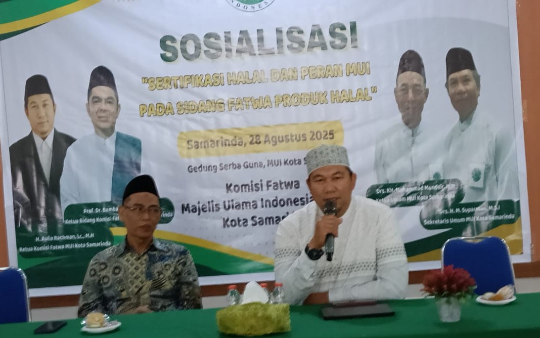 SAMARINDA (Amanah ummat.Com) Komisi Fatwa MUI Samarinda menggelar Sosialisasi Sertifikat halal dan peran MUI pada sidang fatwa produk halal. Acara digelar di Gedung MUI Kota Samarinda Jalan juanda no 19 Samarinda, Kamis 28 Agustus 2025. Selain menggelar sosialisasi, panitia juga memperkenalkan Lembaga Pemeriksa Halal UINSI Samarinda dengan menampilkan (Video) sekitar kegiatan dan kiprahnya.