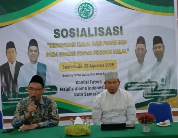 SAMARINDA (Amanah ummat.Com) Komisi Fatwa MUI Samarinda menggelar Sosialisasi Sertifikat halal dan peran MUI pada sidang fatwa produk halal. Acara digelar di Gedung MUI Kota Samarinda Jalan juanda no 19 Samarinda, Kamis 28 Agustus 2025. Selain menggelar sosialisasi, panitia juga memperkenalkan Lembaga Pemeriksa Halal UINSI Samarinda dengan menampilkan (Video) sekitar kegiatan dan kiprahnya.