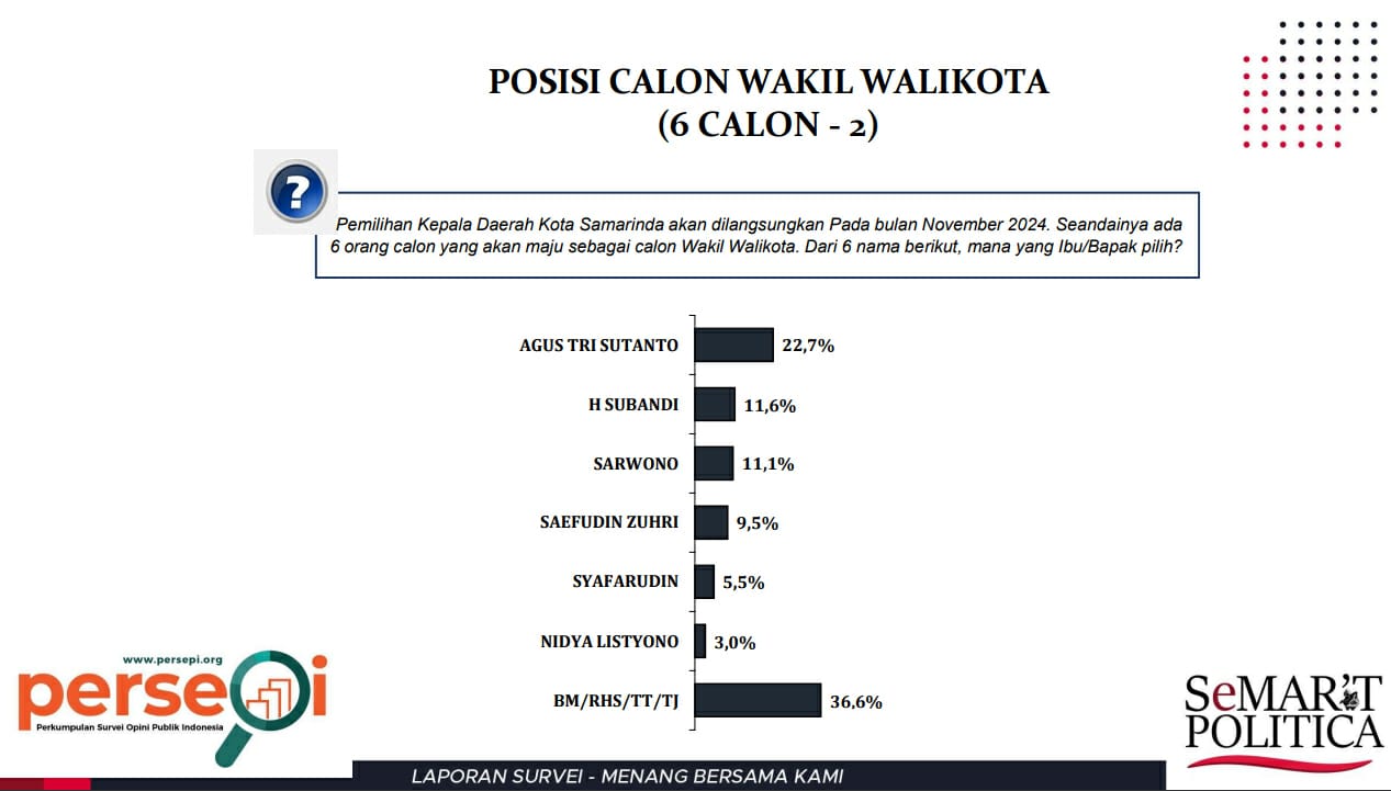 SAMARINDA (Amanah ummat.Com) Lembaga survei dan konsultan politik, SeMAR’T POLITICA merilis survei terbaru elektabilitas calon terkuat Kandidat Wali Kota dan Wakil Wali Kota dalam perhelatan pemilihan kepada daerah (Pilkada) Kota Samarinda 2024.