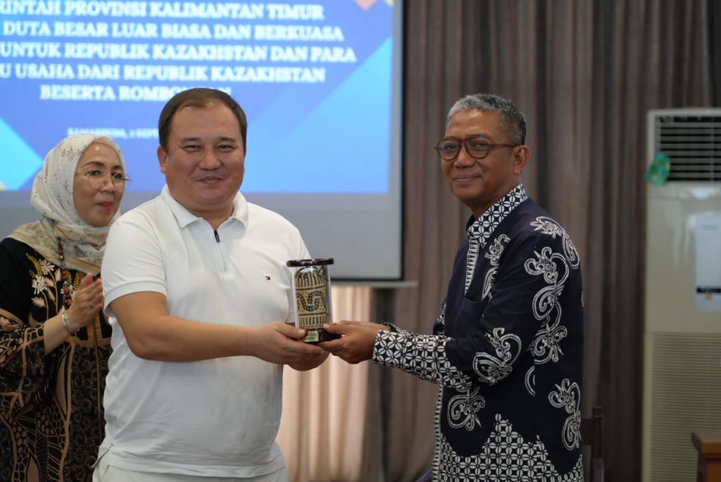 Pemberian cenderamata dari pengusaha Kazakhstan kepada Asisten Sekprov Kaltim.